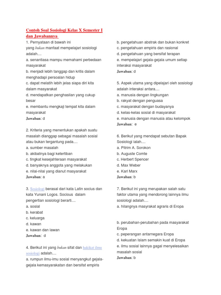 Contoh Soal Sosiologi Kelas X Semester I Dan Jawabannya