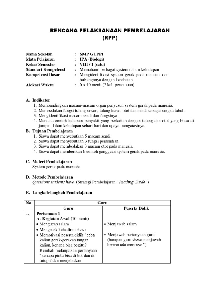 Rencana Pelaksanaan Pembelajaran Sistem Gerak Pada