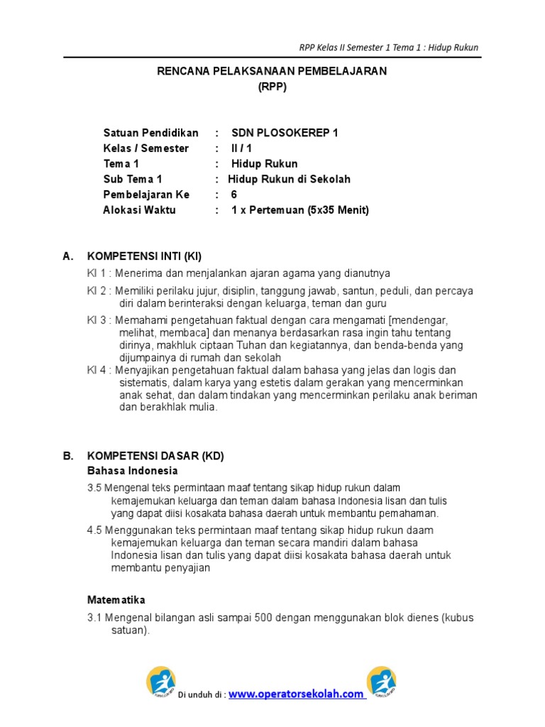 Rpp Tematik Kelas 2 Tema 1 Subtema 1 2 3 4 Semester 1 K13 Tp