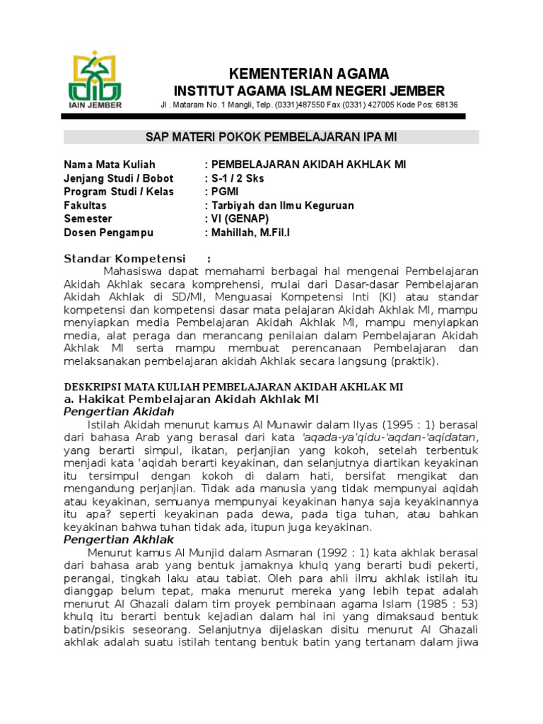 Sap Pembelajaran Akidah Akhlak Mi Bu Mahillah