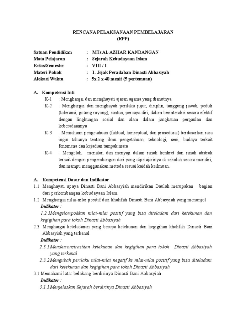 Rpp Sejarah Kebudayaan Islam Kelas 10 Ma Kurikulum 2013 Revisi Penyegaran 2018