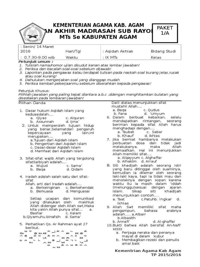 Soal Uas Kelas Ix Paket A Aqidah Akhlaq