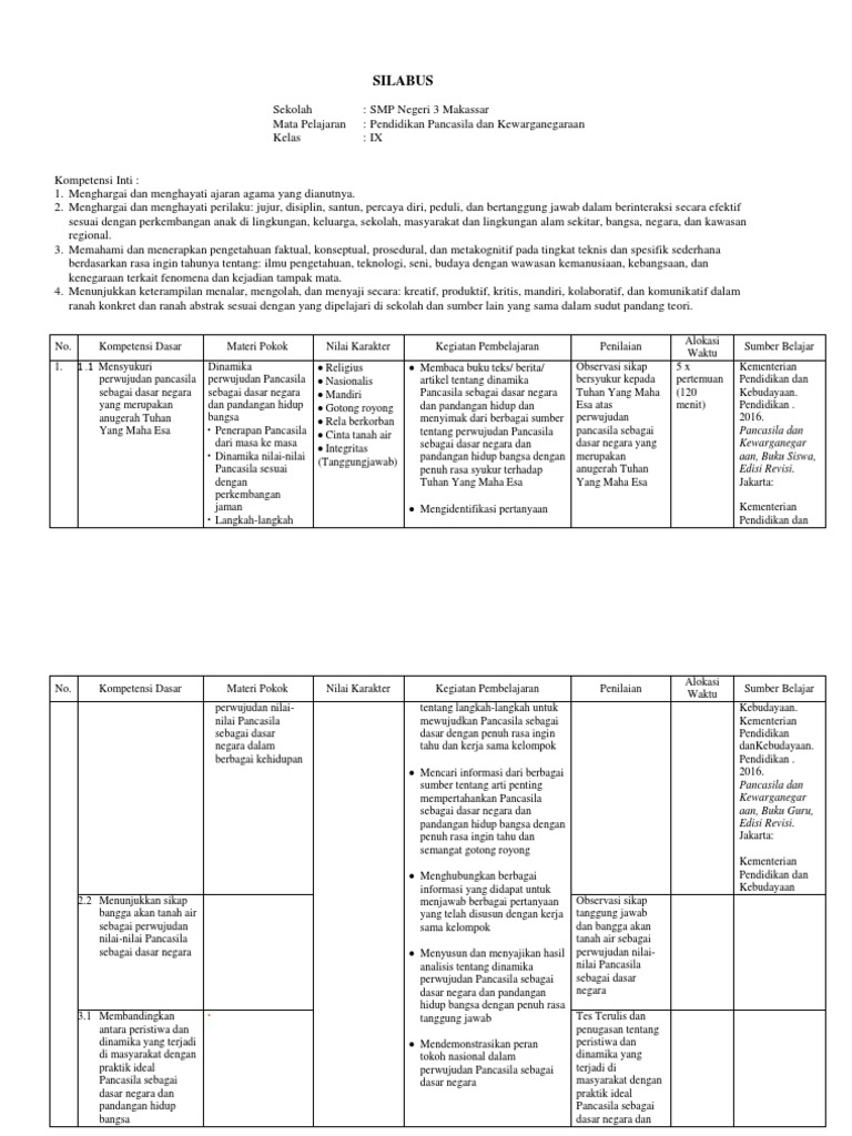 Silabus Ppkn Kelas 9 Revisi 2018