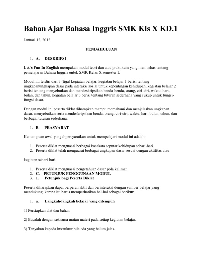 Bahan Ajar Bahasa Inggris Smk Kelas X Kd 1