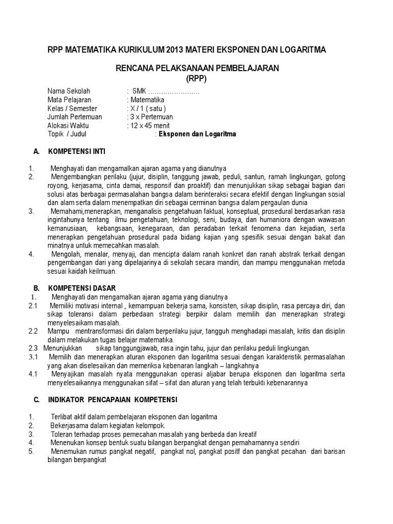 Doc Rpp Matematika Kurikulum 2013 Materi Eksponen Dan