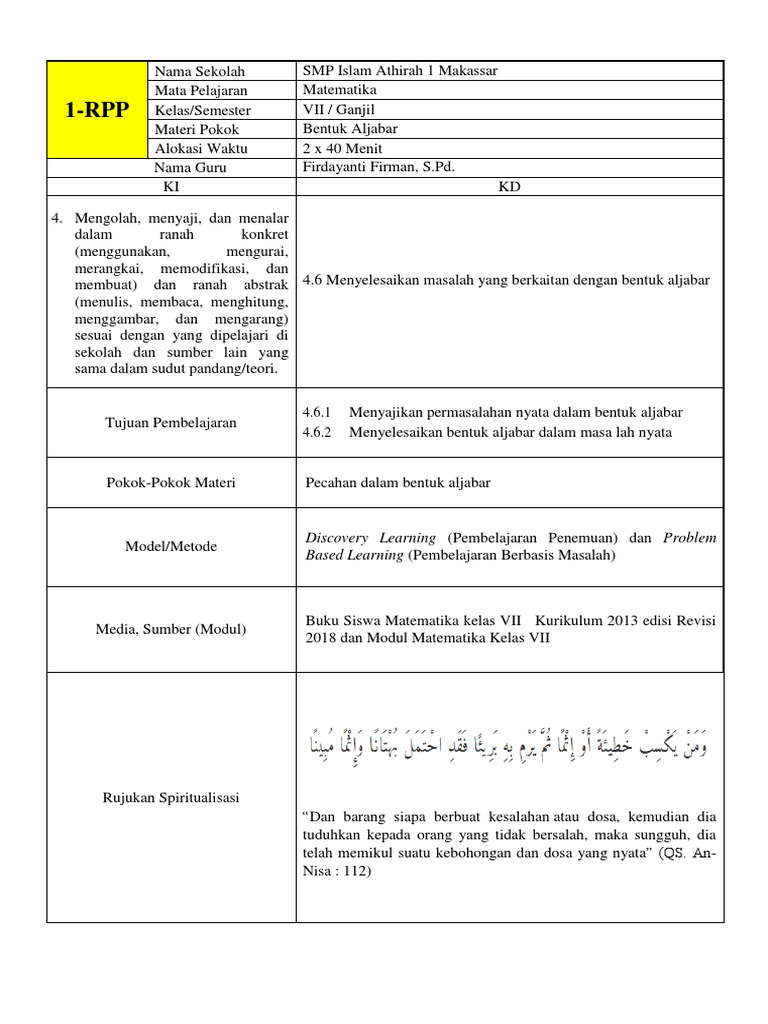 Rpp Bentuk Aljabar Kelas 7 Kurikulum 2013 Revisi 2017