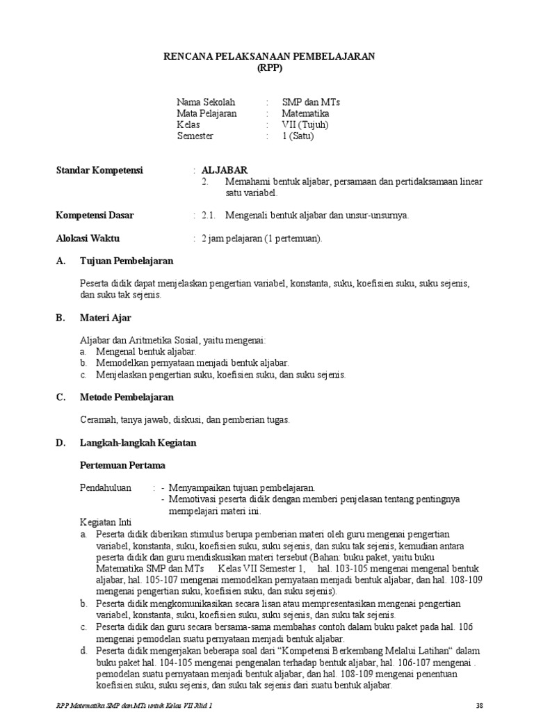 Ulasan tentang Rpp Bentuk Aljabar Kelas 7 Kurikulum 2013.
