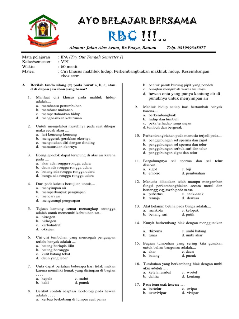 Soal ipa kelas 6 materi ciri ciri khusus makhluk hidup tyas.